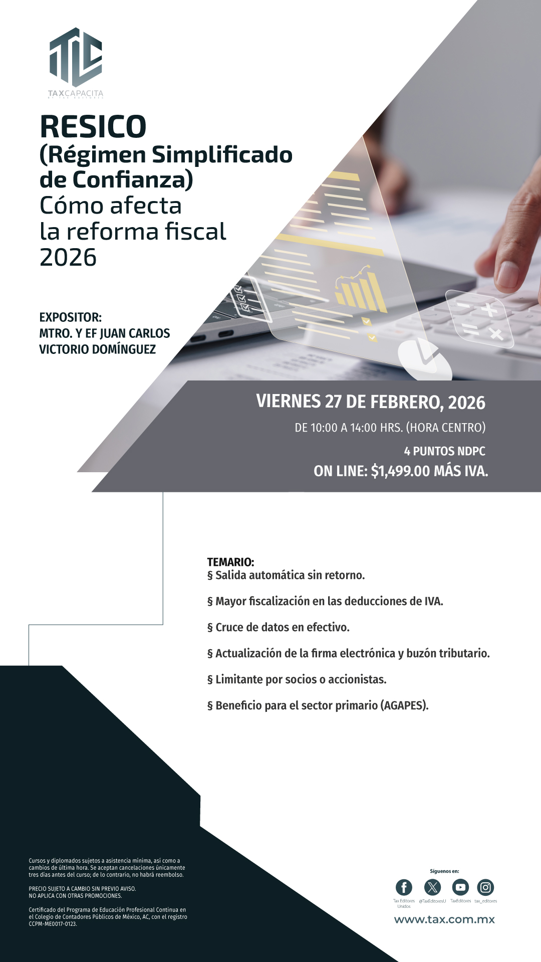 Envíos a todo México por $170.00 / Envíos gratis en compras mayores a $3500.00 RESICO. Cómo afecta la Reforma Fiscal 2026. Salida automática sin retorno. On line Código:01CU108643 Expositor:Mtro. y E.F. JUAN CARLOS VICTORIO DOMINGUEZ Edición: 2026 Fecha:27/02/2026 Páginas:20260227 PRECIO:$1,738.84 Temario