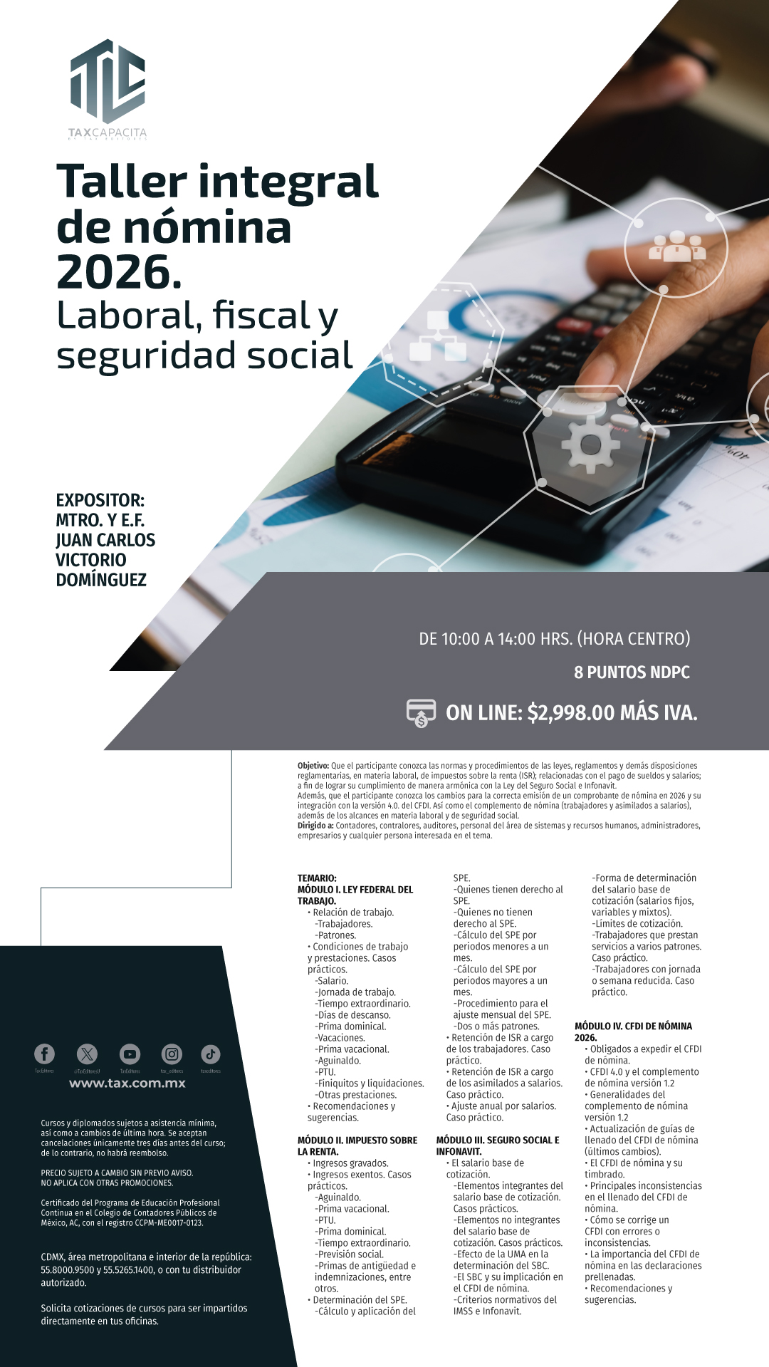 Envíos a todo México por $170.00 / Envíos gratis en compras mayores a $3500.00 Taller Integral de Nómiina 2026. Laboral, Fiscal y Seguridad Social. On line Código:01CU108645 Edición: 2026 Fecha:11/03/2026 Páginas:20260318 PRECIO:$3,477.68 Temario