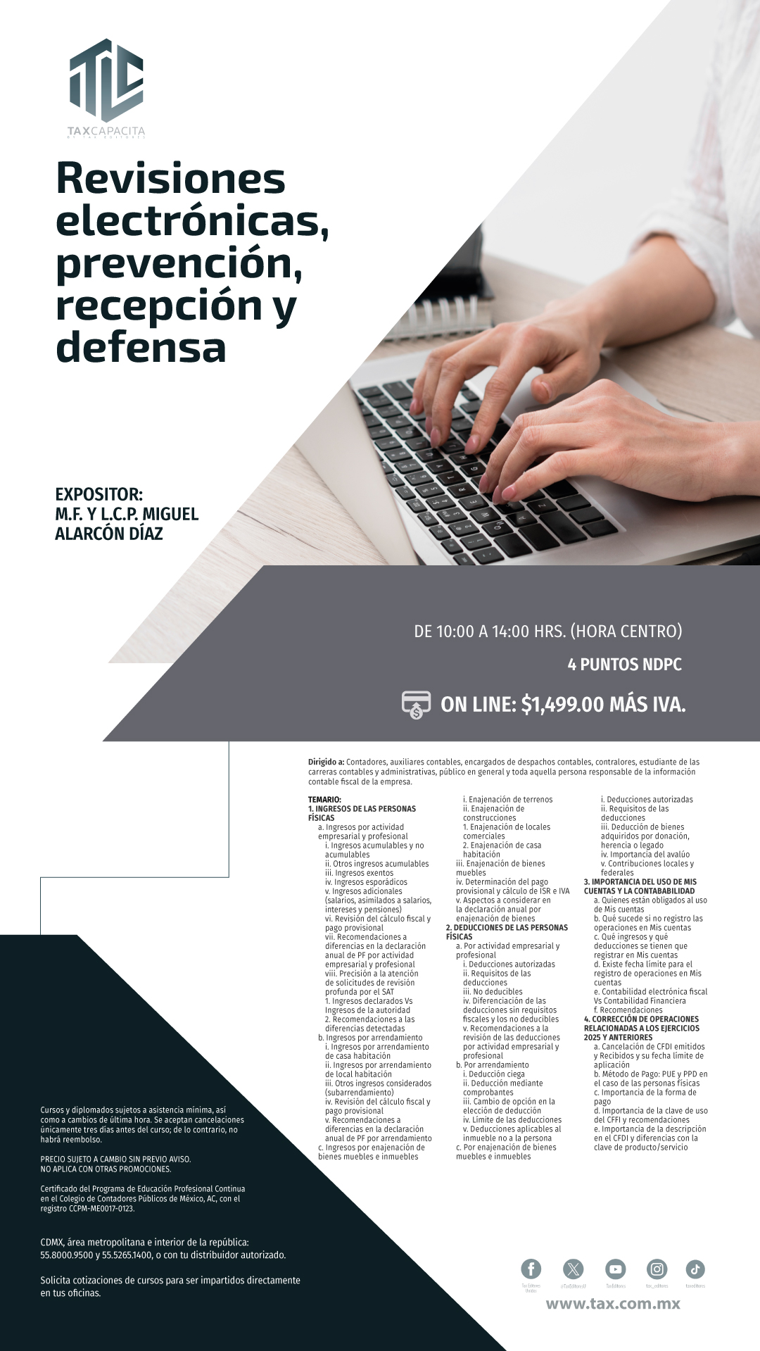 Envíos a todo México por $170.00 / Envíos gratis en compras mayores a $3500.00 Revisiones Electrónicas, Prevención, Recepción y Defensa. On line Código:01CU108651 Expositor:M.F. y L.C.P. Miguel Alarcón Díaz Edición: 2026 Fecha:09/03/2026 Páginas:20260309 PRECIO:$1,739.00 Temario