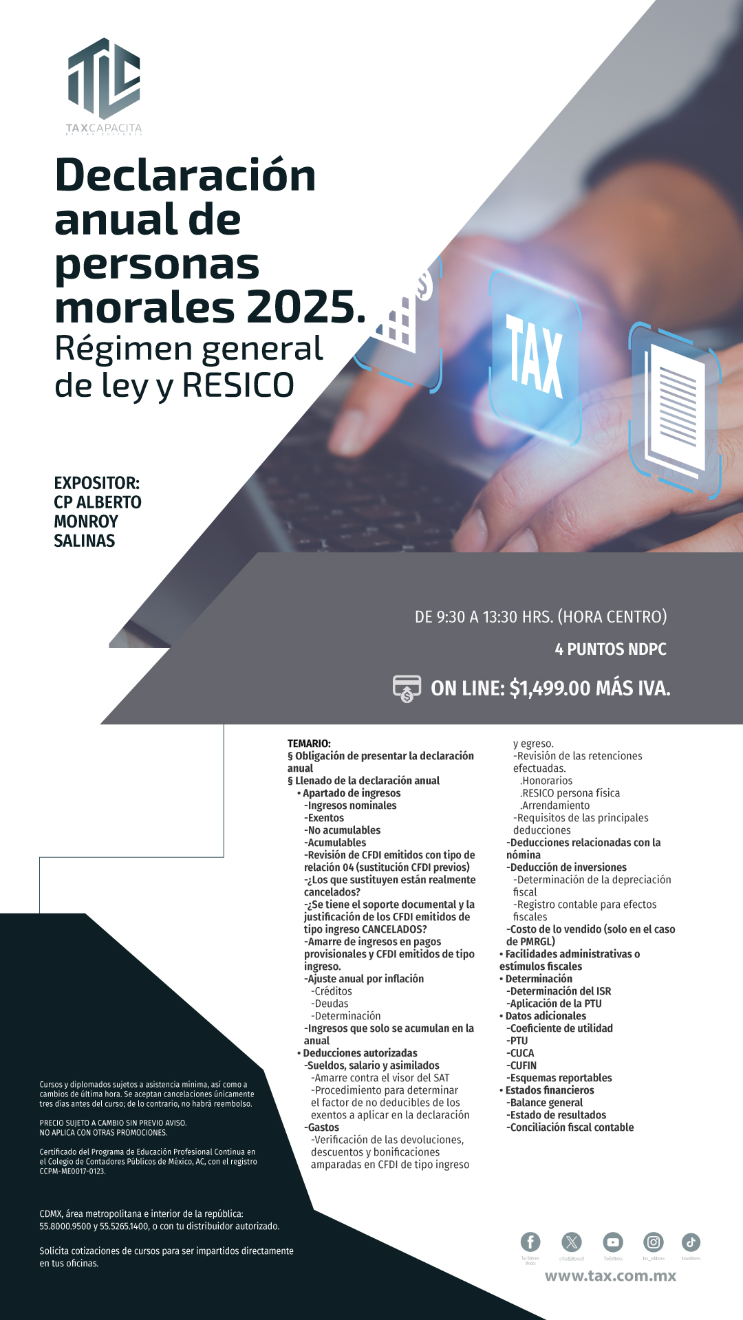 Envíos a todo México por $170.00 / Envíos gratis en compras mayores a $3500.00 Declaración Anual de Personas Morales 2025 (Régimen General de Ley y RESICO). On line Código:01CU108655 Expositor:C.P. Alberto Monroy Salinas Edición: 2026 Fecha:10/03/2026 Páginas:20260310 PRECIO:$1,739.00 Temario
