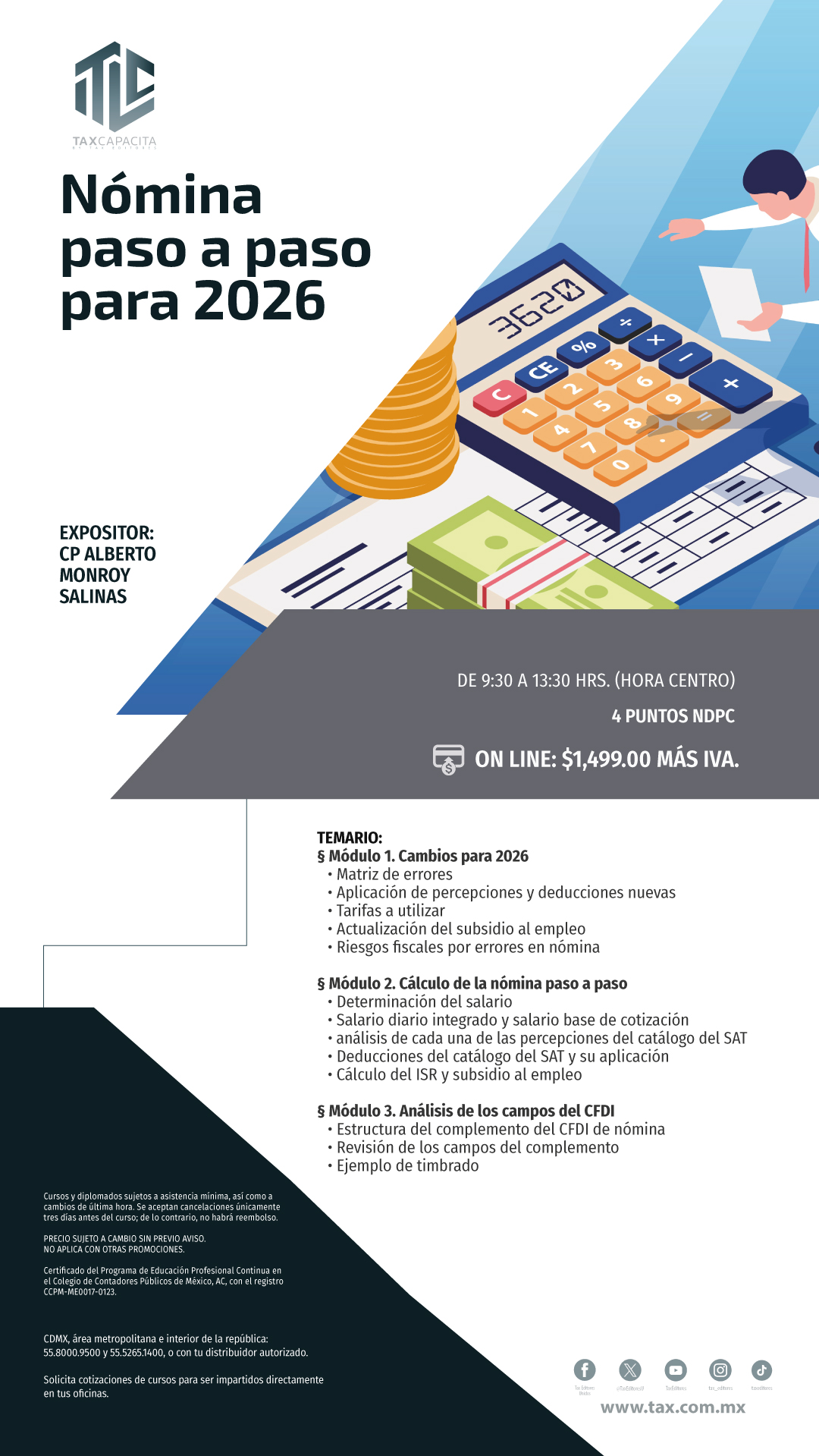 Envíos a todo México por $170.00 / Envíos gratis en compras mayores a $3500.00 Nómina paso a paso para 2026. On line Código:01CU108656 Expositor:C.P. Alberto Monroy Salinas Edición: 2026 Fecha:27/03/2026 Páginas:20260327 PRECIO:$1,739.00 Temario