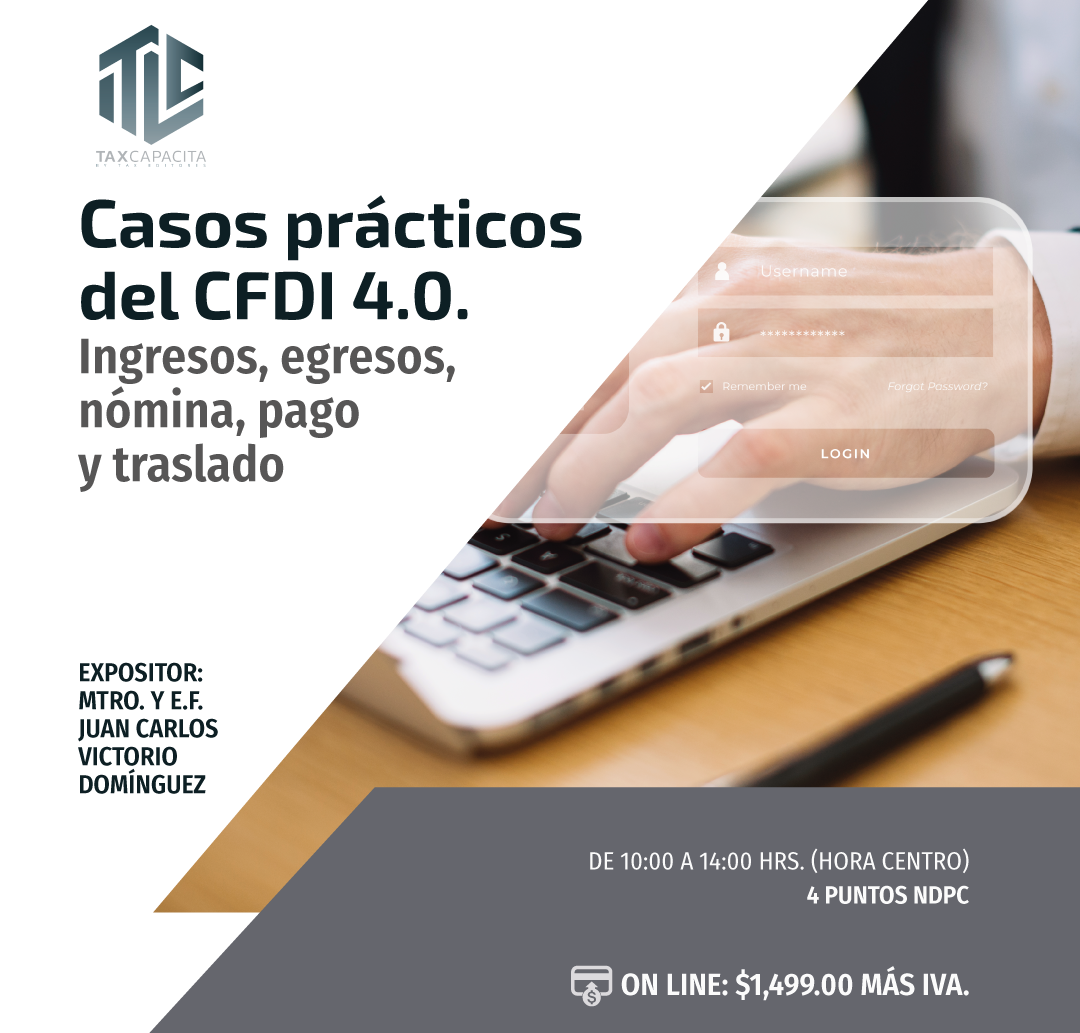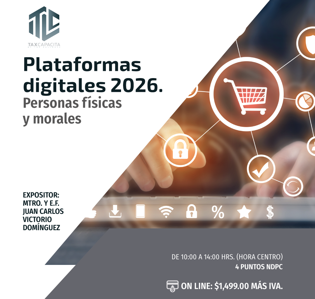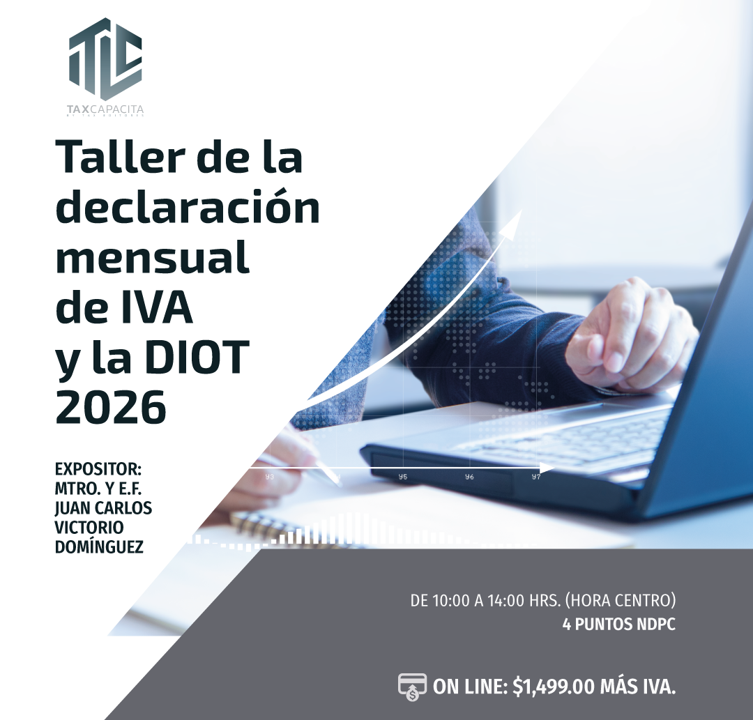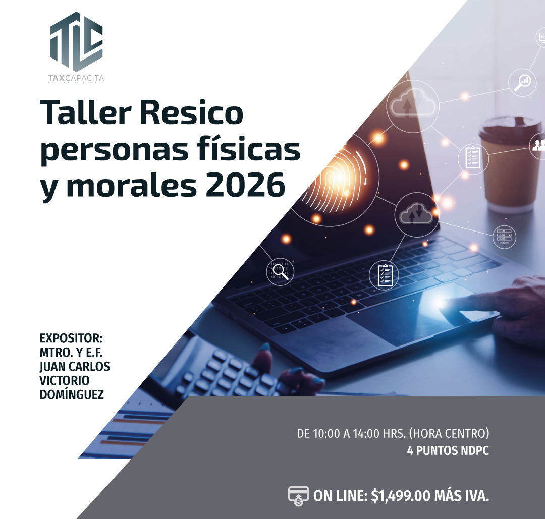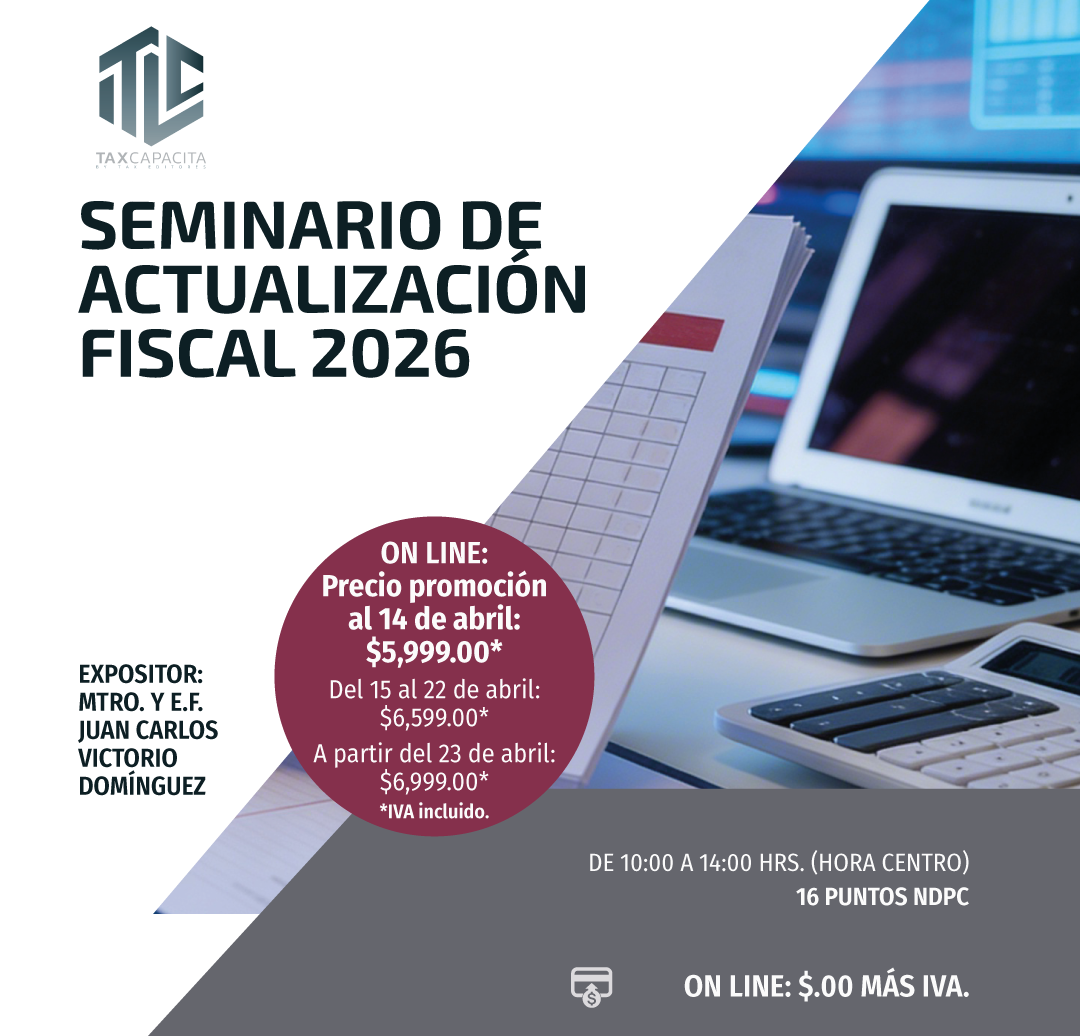 TODOS LOS CURSOS ONLINE Disposiciones Fiscales y los Aplicativos del SAT. On line27/04/2026$ 1739LO QUIERO Tratamiento Fiscal del IEPS 2026. On line28/04/2026$ 1739LO QUIERO Revisiones Electrónicas, Prevención, Recepción y Defensa. On line04/05/2026$ 1739LO QUIERO Taller de Devolución, Compensaciones y Acreditamiento de IVA 2026. On line05/05/2026$ 1739LO QUIERO REPSE y declaraciones informativas. On line06/05/2026$ 1739LO QUIERO PTU. Aspectos Laborales, Fiscales y de Seguridad Social. On line08/05/2026$ 1739LO QUIERO REPSE 2026. Nuevos esquemas de revisión y actualización. On line11/05/2026$ 1739LO QUIERO Sueldos, Salarios, Reembolsos y Dividendos a Socios y Accionistas de las Empresas. On line19/05/2026$ 1739LO QUIERO Seminario de actualización Fiscal 2026. On line20/05/2026$ 6999LO QUIERO Seminario de actualización Fiscal 2026. Módulo I Casos Prácticos del CFDI 4.0,Ingresos,egresos,nómina,pago y traslado20/05/2026$ 1739LO QUIERO Inteligencia Artificial Aplicada a las Nominas 2026. On line25/05/2026$ 1739LO QUIERO Seminario de actualización Fiscal 2026. Módulo II Plataformas digitales 2026, personas físicas y morales On line27/05/2026$ 1739LO QUIERO Seminario de actualización Fiscal 2026. Módulo III Taller de la declaración mensual de IVA y la DIOT 2026 On line03/06/2026$ 1739LO QUIERO Seminario de actualización Fiscal 2026. Módulo IV Taller RESICO personas físicas y morales 2026 On line10/06/2026$ 1739LO QUIERO